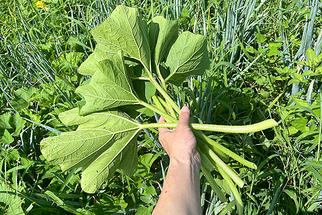 友人が買ったのは、おそらく先端部分の柔らかい部分。ここを摘むとカボチャの成長が止まってしまいそうだが、これ以上畑に広がっても困るので問題はない。ポキッと折らせていただく。