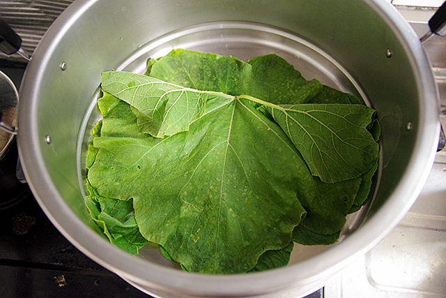 続いては韓国で食べられているという、蒸したカボチャの葉っぱで包む食べ方だ。