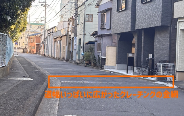 久保:「広大な運動場を持つ学校」の西側の道路にある道幅いっぱいに広がったグレーチングの金網は、道の下に堀跡の名残りの暗渠が隠れていることを示しています。