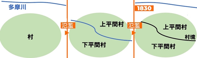 概略図。多摩川が氾濫によって移動し、村を二つに分け、その後また移動した。その結果、村境だけが残った。1830年には多摩川は今の位置にある。