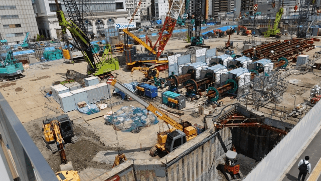 駅の内部やその周りに人はほとんどいないものの、駅から一歩外に出ると重機ファンにはたまらない光景が広がっています。今まさに出来上がってるというところでした。
