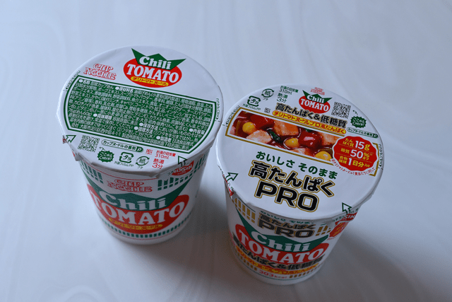 同じチリトマトヌードルでも高タンパク&低糖質のカップヌードルPROもありますね。この2つを冷静に食べ比べてみました。