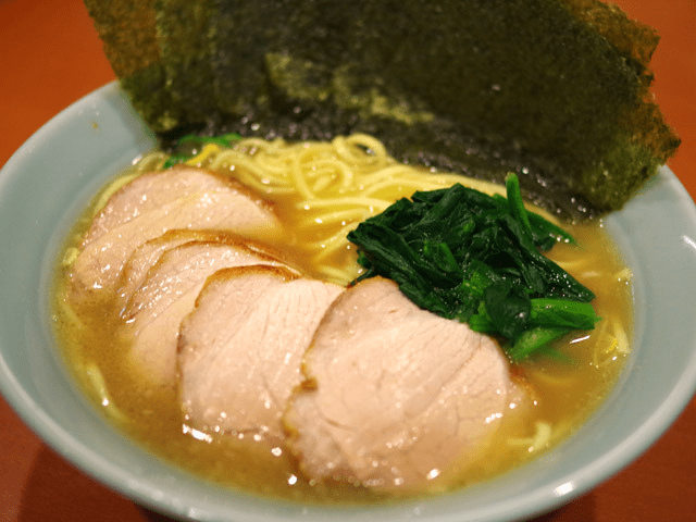 スープを味付けし、麺を茹で、チャーシュー、海苔、ほうれん草をトッピングしてできたのがこちら。