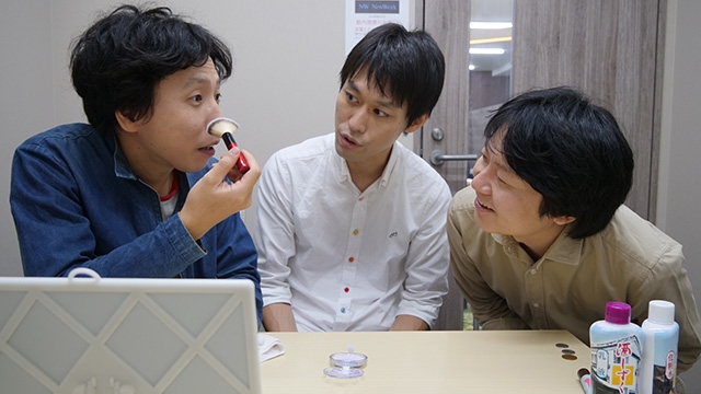 お化粧を体験したいからみんなでやろう、とデイリーポータルZの編集部から藤原浩一、そして女性からの助言をもらうため編集部の古賀さんにも来てもらった。後からライターのトルーも参加する。