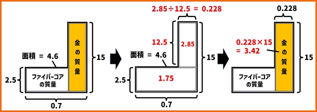 ファイバーコアと金が混ざった状態で、金の質量だけを知るにはどうすればよいか?算数のつるかめ算を使えばいい。数学で言えば連立方程式だ。中学1年生の内容。