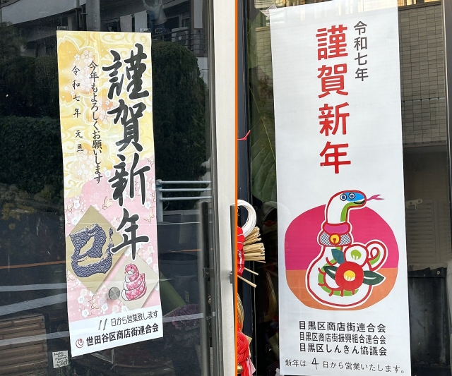 この2つの写真の貼り紙にはどちらも干支のヘビが描かれています。ということは、毎年変わることが確定しています。今度のウマのデザインが楽しみです。(……逆に言えば、これまで出てきた「干支の描かれていない貼り紙」は毎年同じデザインなのでしょうか?)