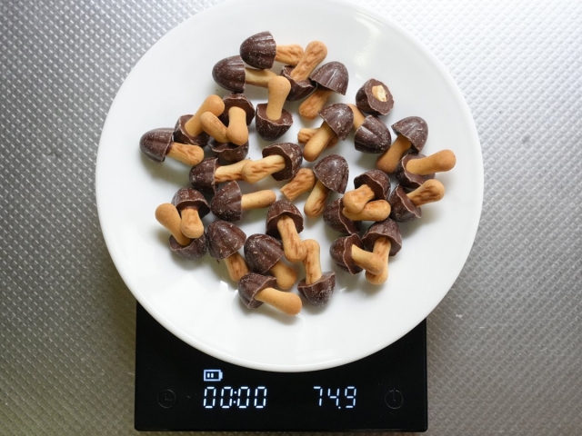 きのこの山・たけのこの里は、1個あたり数グラム。そのチョコ部分だけを比較するには、0.1g単位未満が量れるスケールがあるといい。