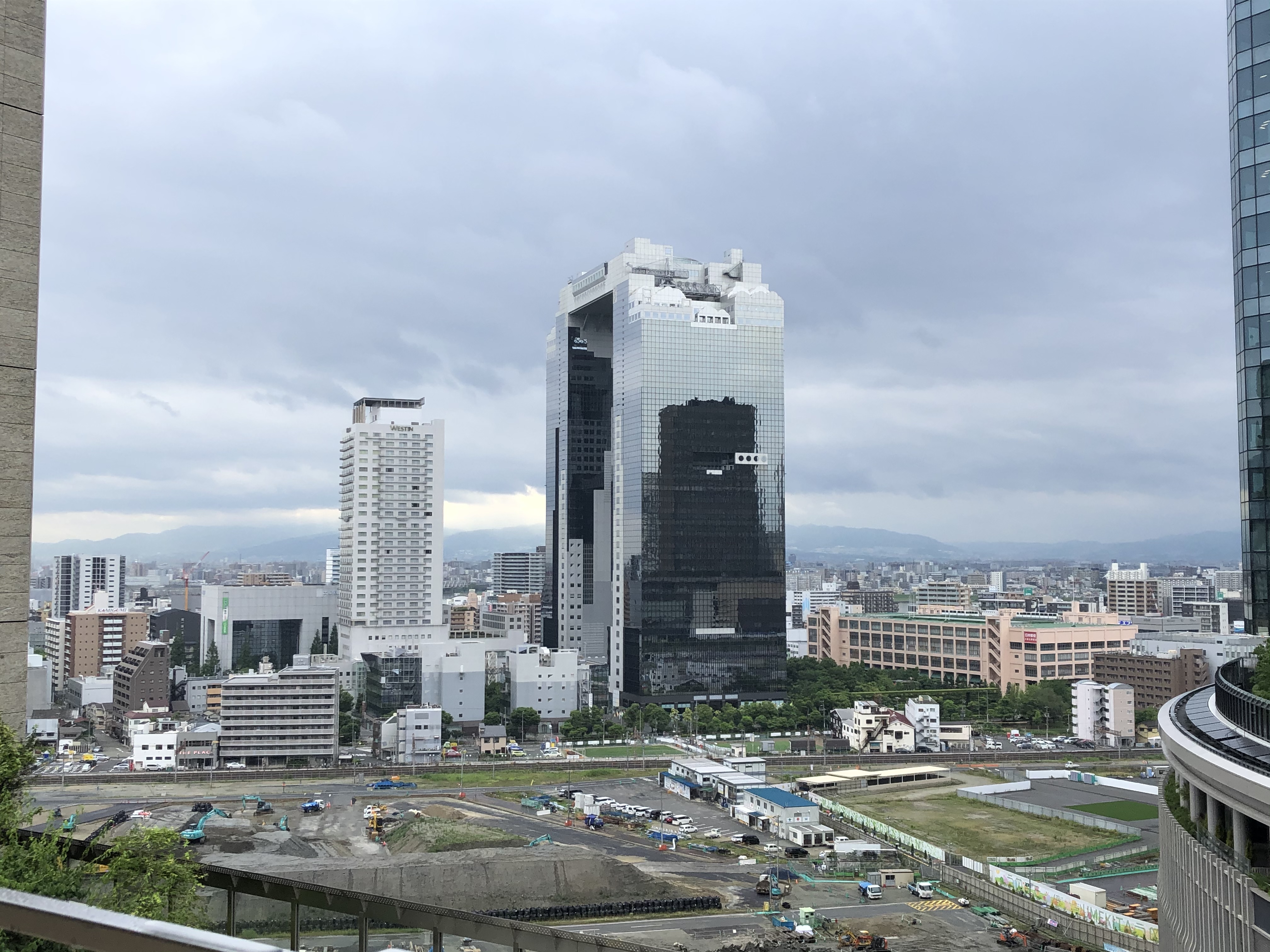 鏡みたいなツルッとしたビルの前に広大な空き地……。これは、大阪駅から、梅田スカイビルを見た景色です。将来的に、手前の空き地になんやかんや建物が建つ予定らしいです。しらんけど。