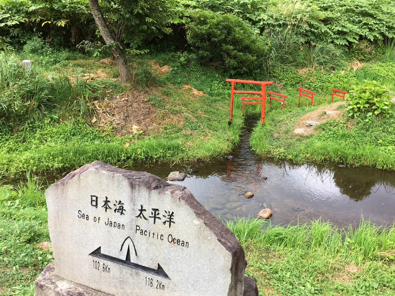 日本海、太平洋と書かれた石。後ろの小川。これは宮城県との県境に近い山形県最上町堺田にある分水嶺です。この地点を境に、太平洋と日本海へ流れる川が分かれているわけです。これは、知っていなければ、一見しただけではわからないでしょう。ここはどこでしょう? というよりも、これはなんでしょう? の方が良かったかもしれません。