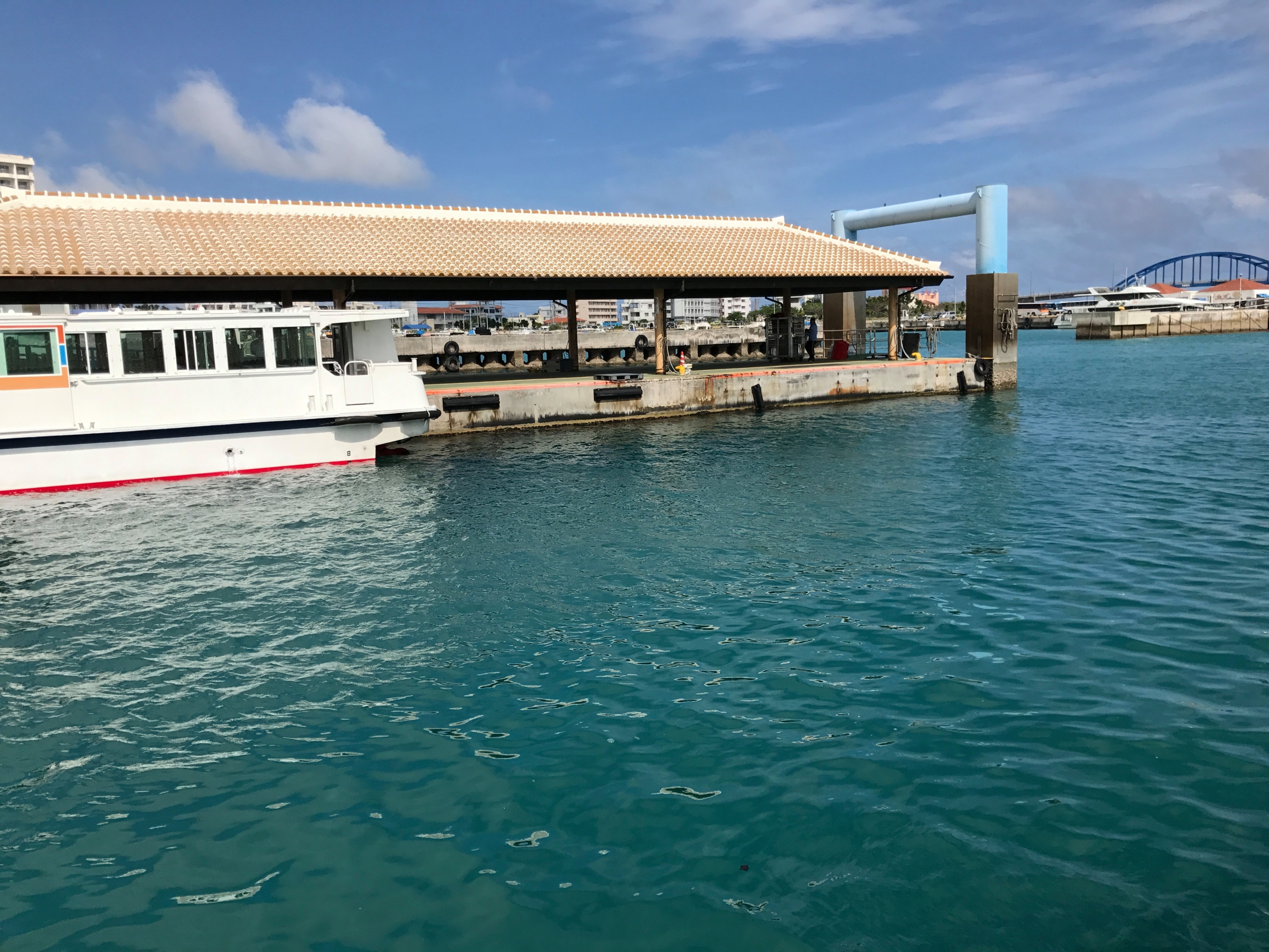 「桟橋の屋根が沖縄の瓦のヤツ」だったので、調べたら「琉球赤瓦」という名であると知り、「琉球赤瓦 船着場」で調べたら、すぐ出てきました。