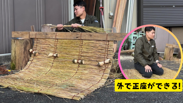 やることはとても単純で、小分けにしたワラの束を紐でひたすら縛っていくだけだ。薦は様々な植物でつくることができるが、今回は稲のワラで編んだ。