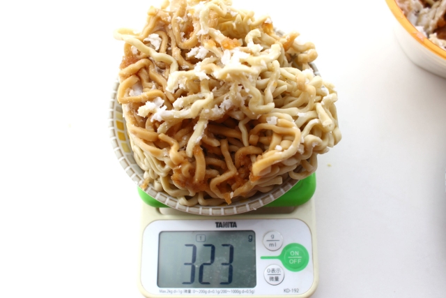 スープとアブラと麺が一体となっていて、分離が難しかったのですが、なんとか分離して計ったら、麺の重さは323g。ブンブンよりは多くて、ローソンよりは少ない。