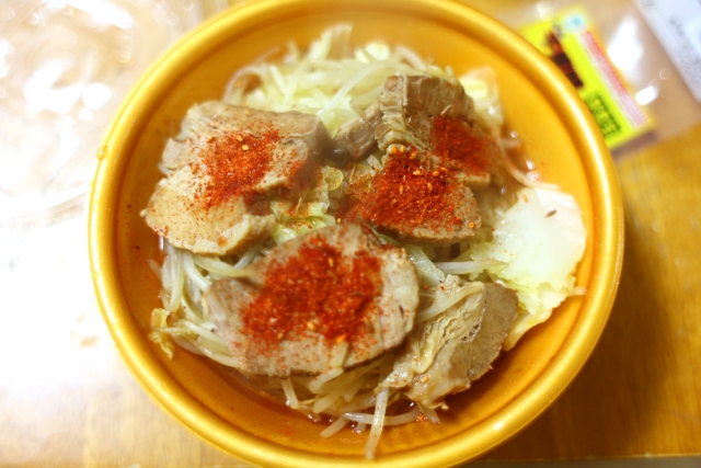 ヤサイの種類は他と同じでモヤシとキャベツ。重さは68gで、ブンブンの184g、ローソンの107gと比べて少なめです。