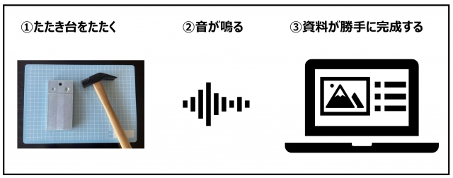 本物のたたき台(物理)をたたくと、偽物のたたき台(資料)が完成していくシステムだ。