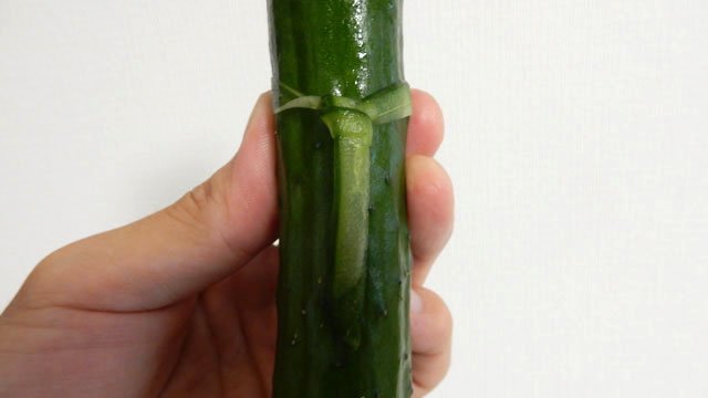 ネクタイほど長さがないので太いものには巻けない。細いものを探してきゅうりを見つけた。