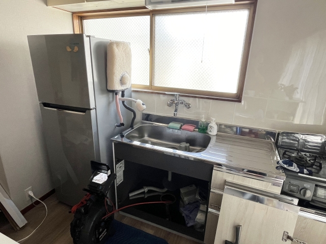 本当は壁につけたかったが、流しの周りが窓でつけられないので冷蔵庫につけることに。この状態で給湯器として使うのは不安だが、そもそも使えないので全く問題ない。