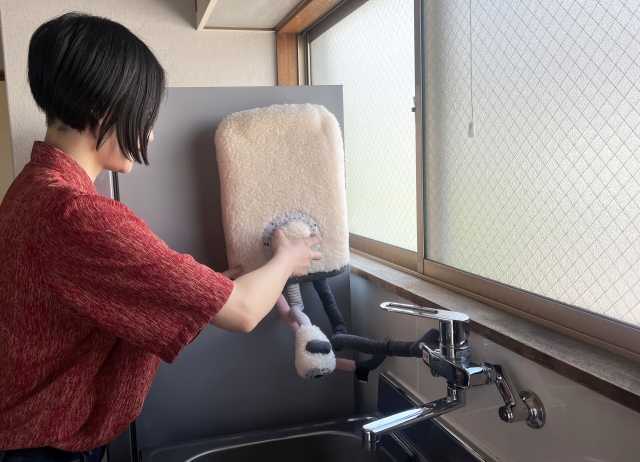 後ろにひもがついているので、引っ掛ける場所があればどこでも給湯器をつけられる。