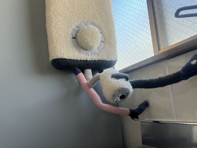 給湯器のぬいぐるみがあるだけで昭和のキッチンになるのはライフハックではないか。もう少し花柄のアイテムがあった方が理想の昭和キッチンに近づくので、次は花柄の鍋のぬいぐるみを作ります。