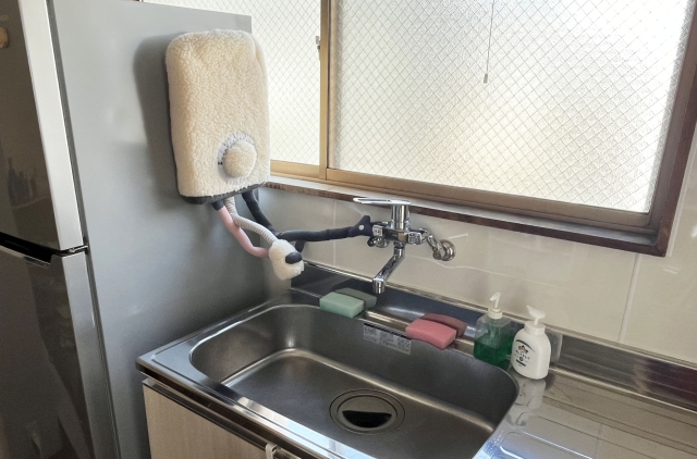 廊下からお湯がでると思うと不安になった。給湯器が水場以外にあると心配になる。ぬれても問題ない外の方が良いのではないか。