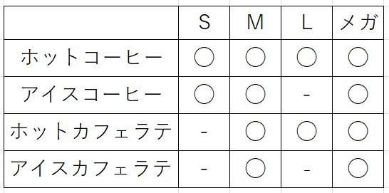 ローソンのコーヒーのサイズをまとめたのがこちらの表だ。