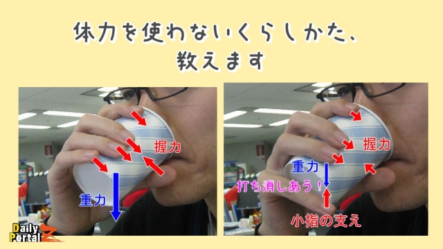 違いは小指の使い方。左は一般的なコップの持ち方、右は僕のコップの持ち方。右の方が楽であることにお気づきだろうか。ピンとこない方のために、図で説明しよう。