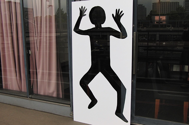 東急ハンズで買ってきたスチロールの板に穴を開けて作る。この素材は過去にも顔ハメ、でかいタバコの箱、でかい顔などで使用した馴染みの素材だ。軽くて加工しやすい。