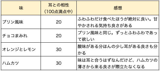 いよいよ食べた感想である。12種類を耳との相性によって3つのグループに分けた。まずこちらが『耳ない方がいい』グループ