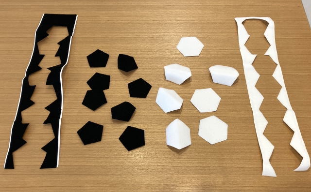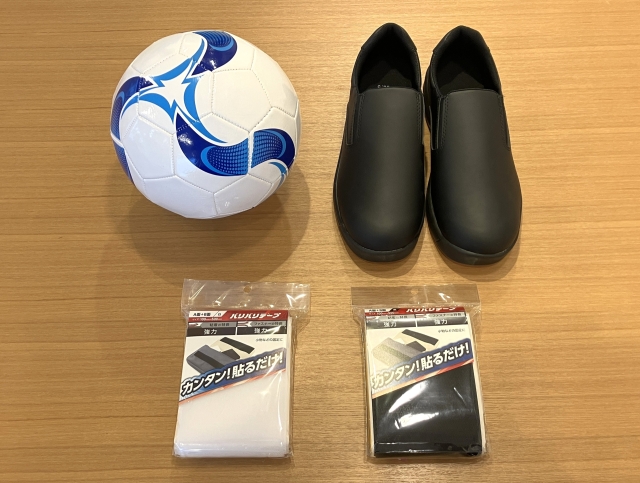 用意するものは、土台となるサッカーボールと靴。そして裏面がテープになっているタイプのマジックテープ(白・黒)だ。