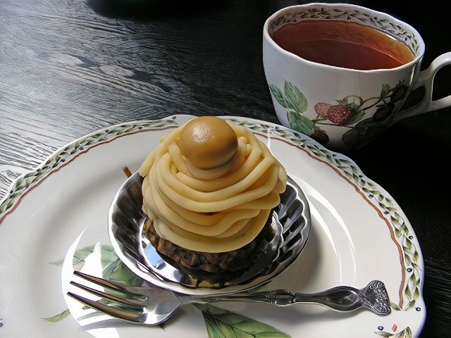 ケーキ皿に乗せてフォークを添えると、ケーキとしてのモンブラン性がアップ。さらに紅茶を淹れて横に置けば、それはもう素敵な午後のティータイムだ。