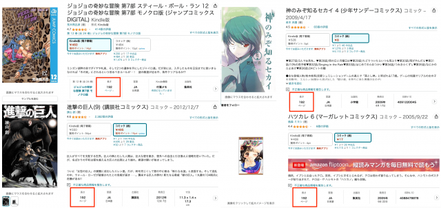 そして次にAmazonで該当作品を検索し、それぞれの通常巻と最終巻のページ数を記録した。