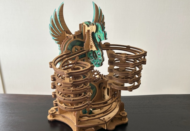 カラカラと音を立てながら歯車がまわり、銀の球を持ち上げる。球はドラゴンの口から吐き出され、左右のレールを伝って流れ落ちる。
