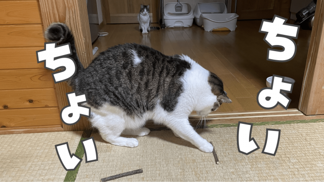 かじりついて興奮したのは数十秒くらいで、あとはただの枝として遊びはじめた。見慣れないものを前足でちょいちょい触るのがおもしろいらしい。