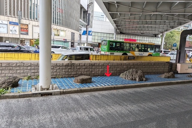 これはたぶん、新数寄屋橋の橋脚が下りてくる場所にちょっとしたスペースが必要だったということだろうか。車道にいきなり橋脚が立っていたら、夜間に車やバイクが間違ってぶつかってしまうかもしれない。だから車道自体を狭くする必要があって、すると帯状に土地が余る。殺風景なので岩でも置こう、という感じだろうか。