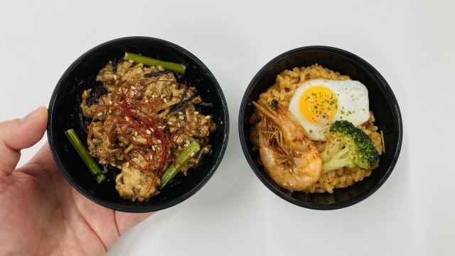 これが、買ってきたminiどんぶり、焼肉丼とナシゴレンである。