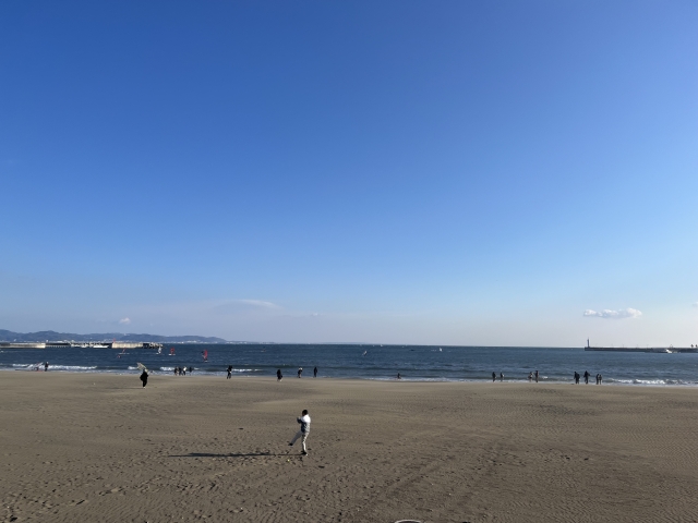 ものすごく寒い上に強風だが、けっこう人がいて驚いた。なんならサーフィンしている人もいる。風の影響で全く成立していなかったが、バトミントンをしている人もいた。