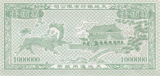 冥幣の額面は、適当に価格を釣り上げてもべつにだれからも文句を言われる筋合いはないので、言うに事欠いて「100万億」という紙幣まである。