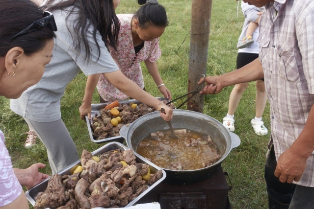 まこ:ホルホグっていう料理で、鍋にお肉とアツアツにした石を一緒に入れて、蒸し焼きにします。