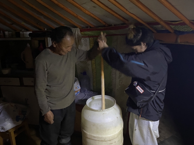 まこ:夜になると、馬乳酒を混ぜる仕事があります。一晩中ジャボジャボ混ぜて、去年聞いた時は1万回とか10万回混ぜるって言ってて。1日か完成するまでかわからないんですけど、1日かもしれない。