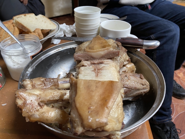 まこ:そうですね。クリームに近い。バターと生クリームの間みたいな感じですかね。めちゃおいしいです。そのあと隣のゲルに呼ばれて、こっちではヤギを食ってましたね。
