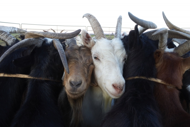 草食動物の視界は広いので、たぶん正面以外のヤギたちとも目があっているんだと思う。いや、こちら側(人間)の視界はそんなに広くないので、厳密には目が合っているとはいわないんでしょうか。