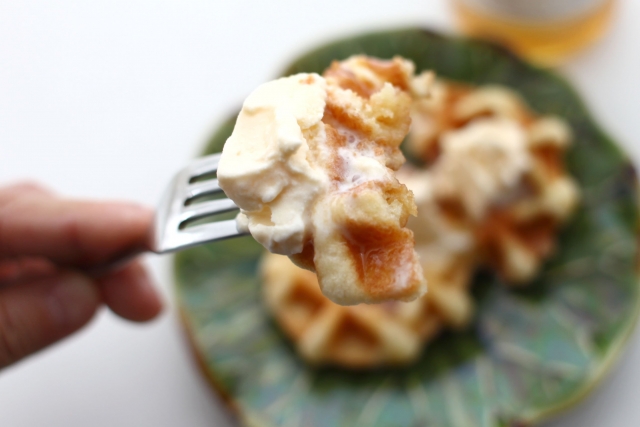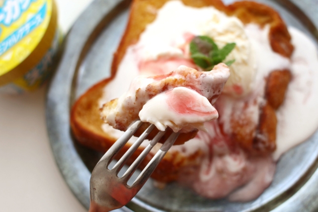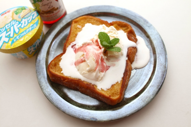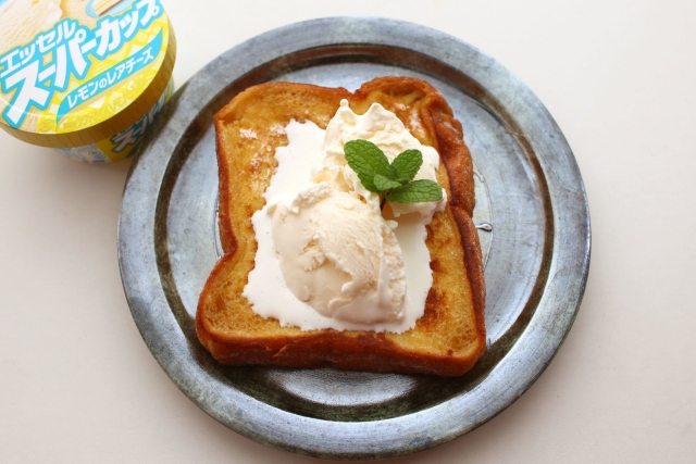 フレンチトーストの上に乗せるアイスは、最近お気に入りの『エッセルスーパーカップ レモンのレアチーズ』。レモンの香りとチーズの濃厚さにハマりました。レモンピールまで入ってるんですよ。