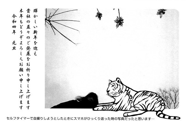 これは分かる。干支のトラにかけたんですよね?!これまで理解の手がかりがない年賀状ばかりだったので伝わるし嬉しい。トラですよね。そうじゃなかったら困る~。