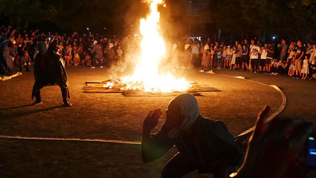 そうこうしてるうちに夏みかん公園(名前かわいすぎだな)に到着し、松明が集められて燃やされる。夜空に熱せられた缶がはじけた音が響く。