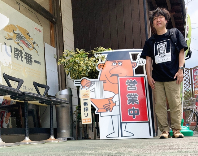 しかしお店の方はすごく優しく「20時で閉店なんです」と言い、「遠くから来てくださったんですか?」と聞いてくれた。そこで、以前からこのお店が気になっていて、ラーメンも食べたいし、カレーも食べたいのでまた夜に来たいことなどを喋った。「あの看板のキャラクターが可愛いですね」というと、「ありがとうございます。表にパネルもありますよー!」と教えてくださった。お礼を言って店を出て、セルフタイマーでパネルとツーショット。