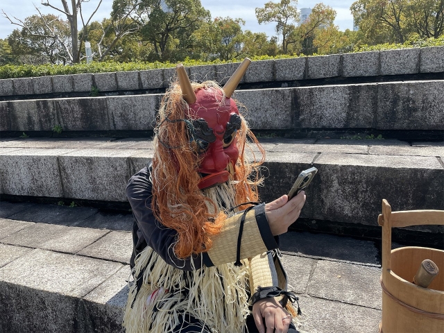 普通に挨拶をしてしまった。なまはげがリュックを背負っているのは荷物を置く場所がなかったからだ。20年前、撮影中に置き引きにあった経験をまだひきずっている。