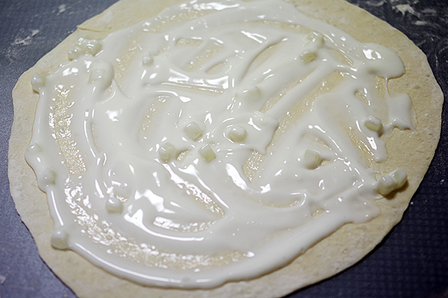 ピザの生地を伸ばして、ナタデココ入りのビヒダスを1パック分塗りたくる。