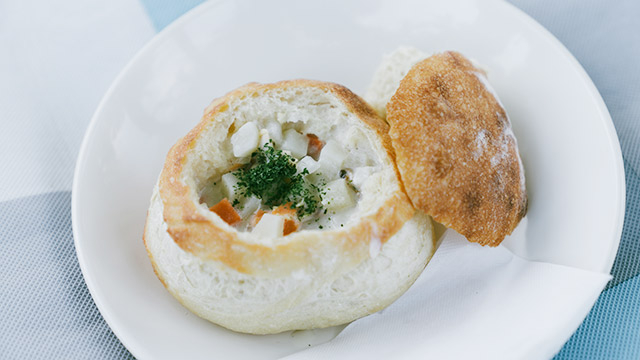 ブールというパンを器にしてクラムチャウダーを注ぎ込む。パンとスープは鉄板の組み合わせだ。この記事では基本、美味しいとしか書かない。だって美味しいのだ。クラムチャウダーも海鮮の味が生きていてパンと相性は抜群だ。