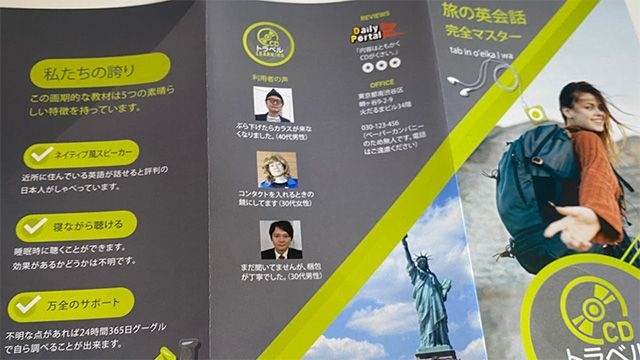 そのためにインチキっぽいパンフレット作って、おかしなシチュエーションばかり選んだ会話のCDも作った。