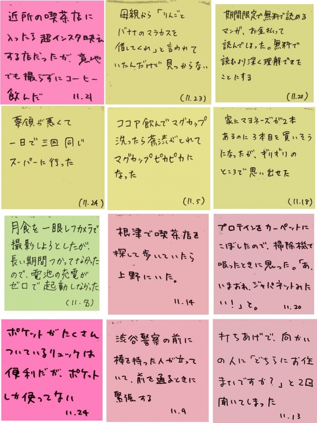 俳人のようにふせんを取り出してサラサラと書くつもりだったが、それはできなかった。スマホにメモを書いておいて、翌朝に手描きでふせんに転記していた。