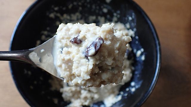 完成したらだまされたと思って目を閉じて食べてみてもらいたい。オートミールのねっとりした食感と豆乳の絶妙な穀物くささ、そこにレーズンの甘酸っぱさと砂糖が加わることで、トータルでなぜか焼き芋を食べているみたいな気持ちになるのだ。